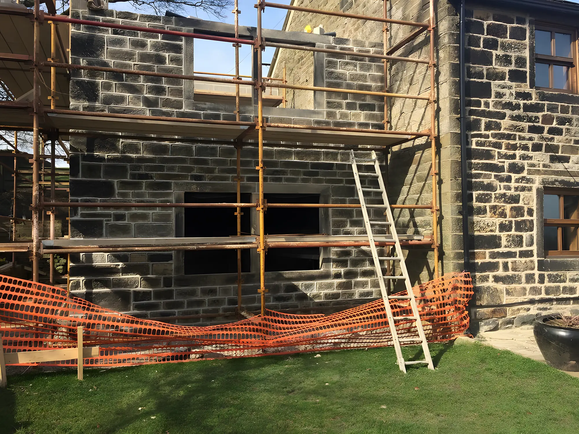 For the extension to the farmhouse we supplied Punched Faced random sizes. As old, reclaimed stone was unavailable at the time, new stone was made and blackened so it would match the existing house as close as possible, Reclaimed stone slates, heads and cills were made to match the original.